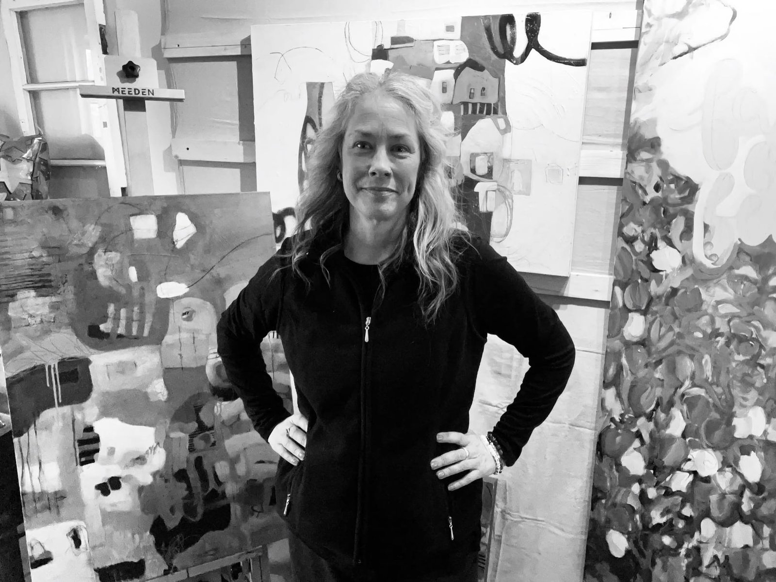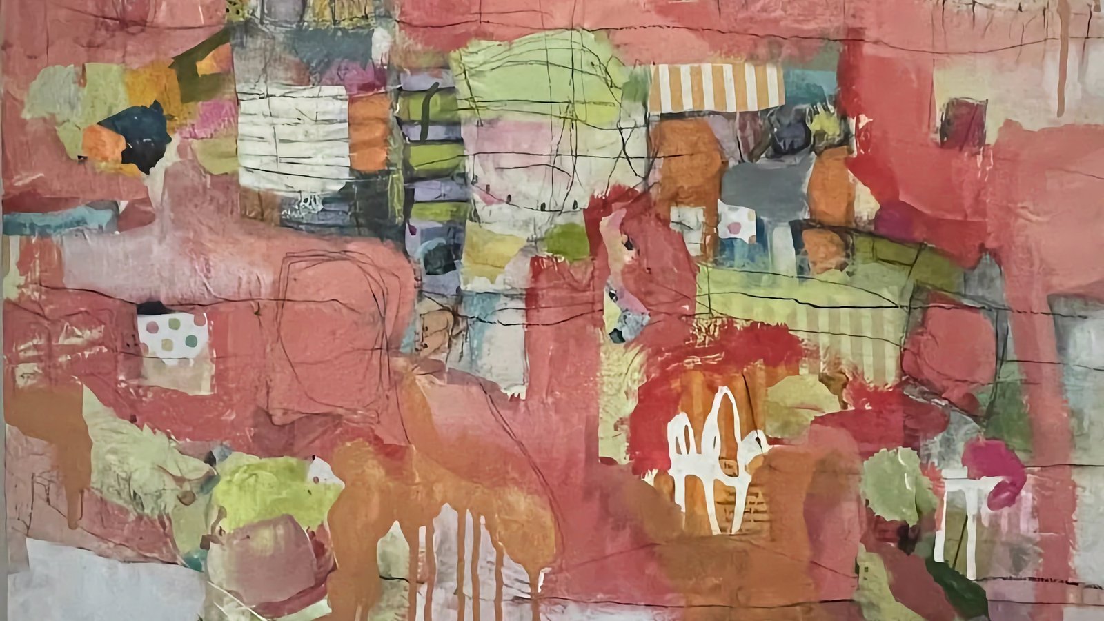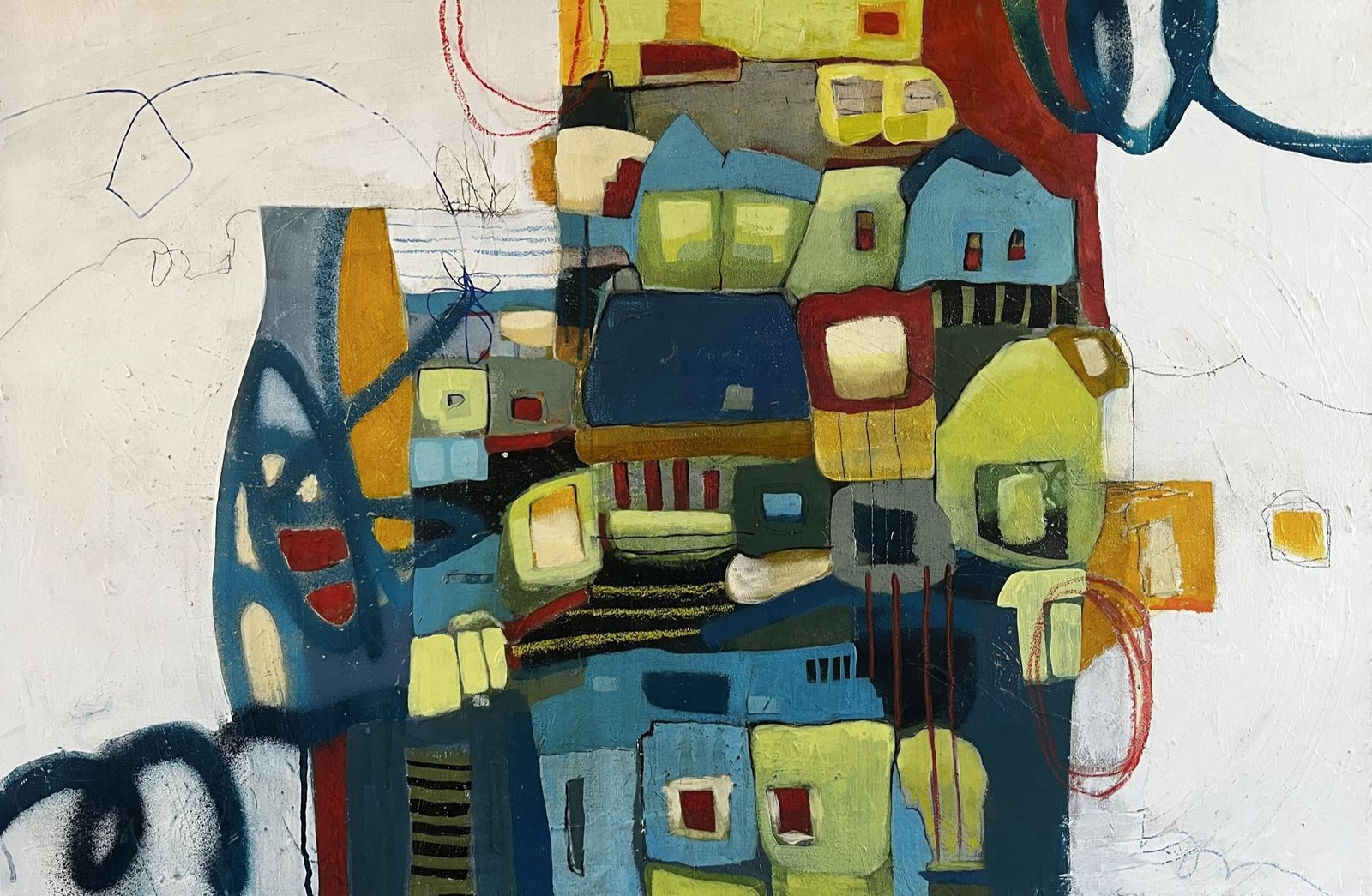 O’Connor draws her lineage from the post-war avant-garde women who boldly redefined what painting could be—Grace Hartigan, Joan Mitchell, Helen Frankenthaler—artists who worked from instinct and emotion rather than program. Like them, she begins without a fixed destination. Her home studio—occupying her living and dining room, close enough to daily life that inspiration can be seized the moment it surfaces—is alive with the tools of exploration: acrylics, collage, mark-making implements, fibers, ephemera. She balances a corporate career alongside a committed studio practice, and that tension, she has noted, has its own rhythm. The work doesn’t wait for perfect conditions. It happens within them.