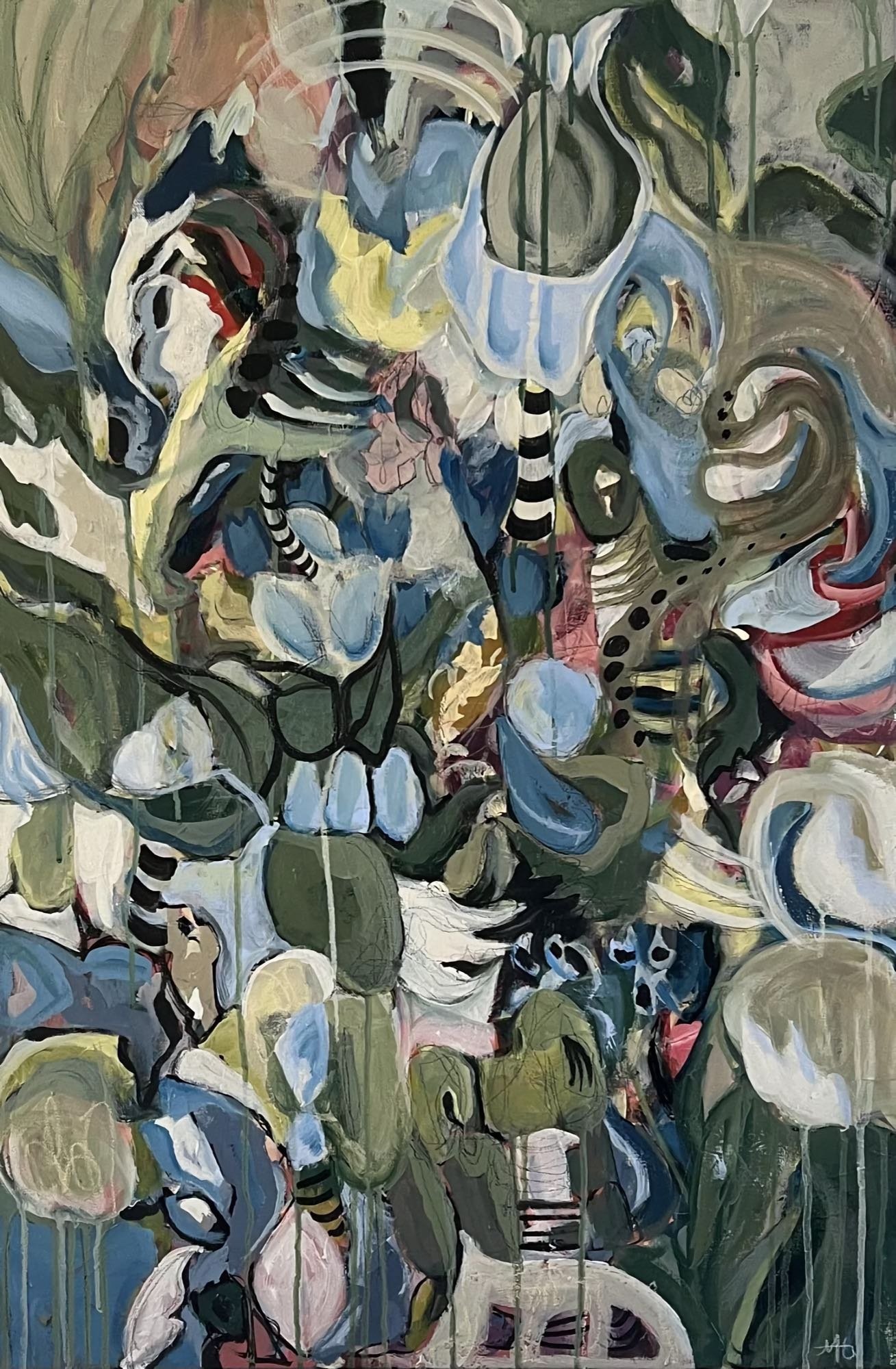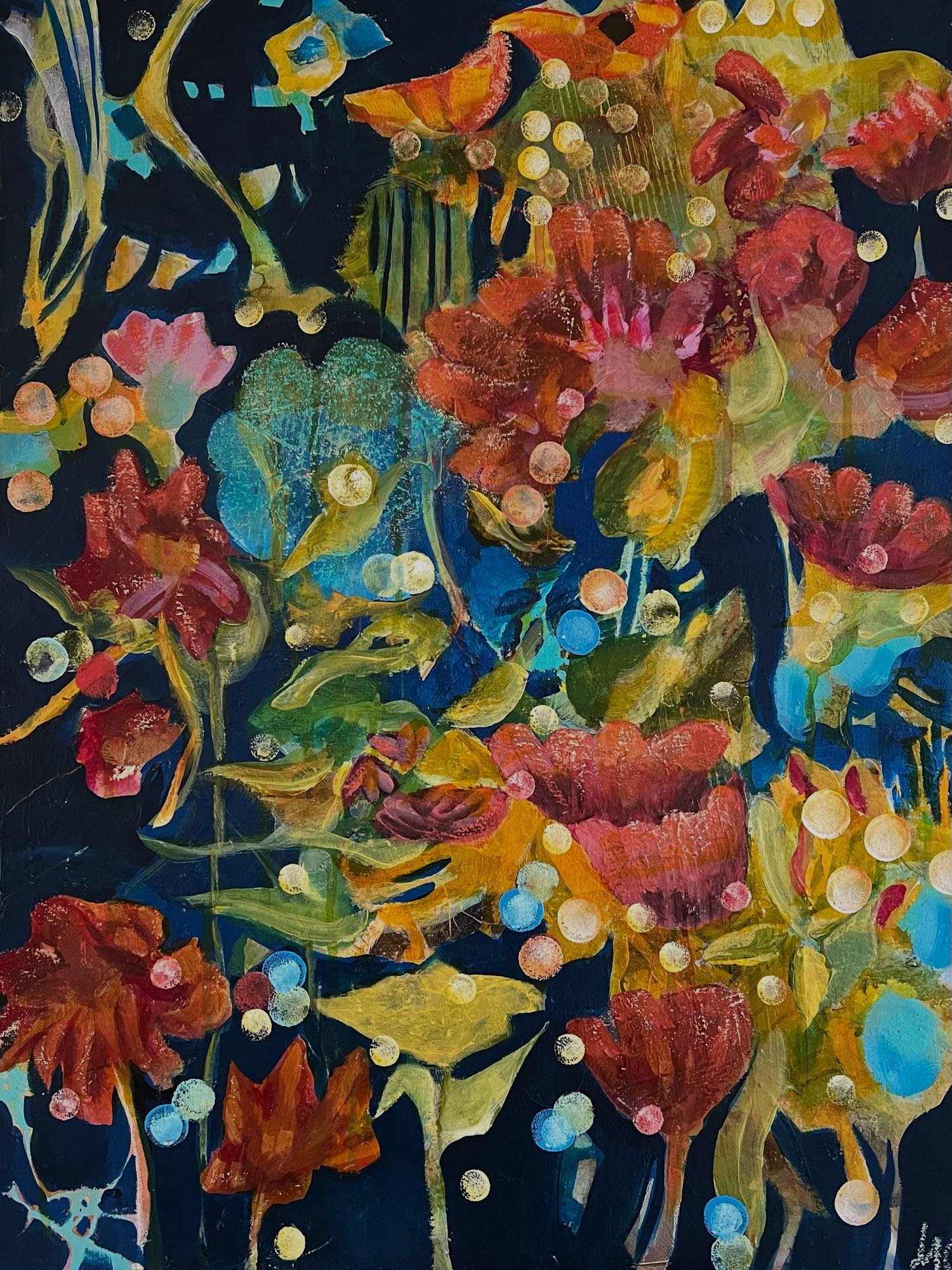 Her process is also her philosophy. Each painting builds through layers—some of which will be painted over, obscured, made invisible. But nothing truly disappears. “Even when something disappears,” she reflects, “it doesn’t really go away—it just changes how the rest of the painting behaves.” Her semi-abstract floral Illumina is a quiet proof of this. The reds, greens, and aqua fragments of flowers were already present—already doing their work—when a deep inky navy background was added late in the process. That single decision changed everything. Suddenly the forms weren’t sitting on the surface anymore. They felt suspended, luminous, like a garden glimpsed after dark. The painting, she has said, slowly learned how to glow.